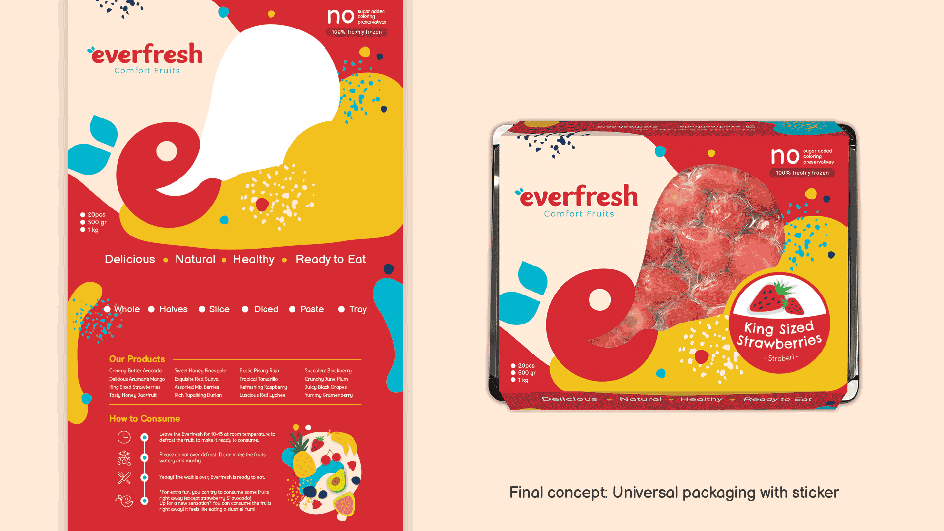 “e” also depicts happy person (side view) enjoying everfresh products - more than 1 person represents family, a group of people enjoy the products together, inspired by the heartwarming tagline of the brand "comfort fruits"